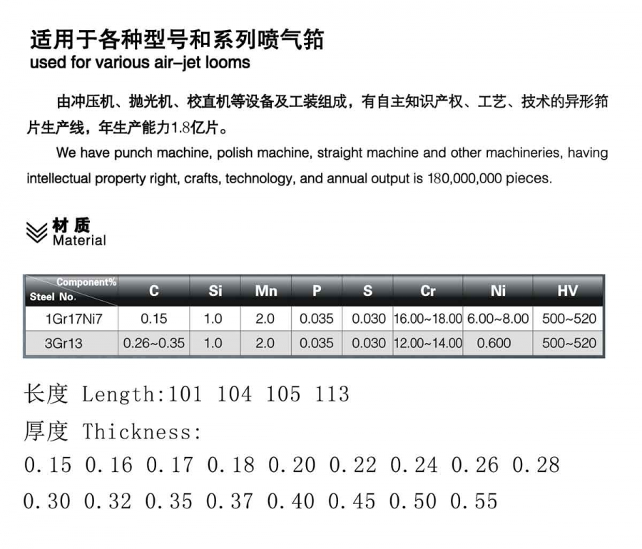 Product description:適用于各種型號和系列氣筘的異形筘片,由沖壓機(jī)、拋光機(jī)、校直機(jī)等設(shè)備及工裝組成,有自主知識產(chǎn)權(quán)、工藝、技術(shù)的異形筘片生產(chǎn)線,年生產(chǎn)能力2億片